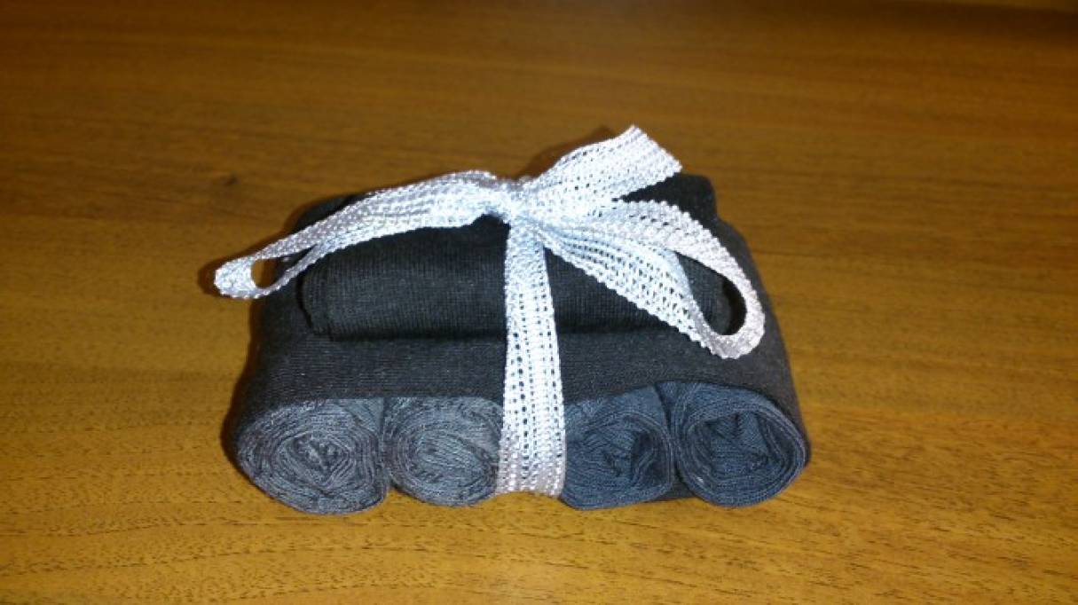 Нам понадобится 3 пары носков (у меня 2 пары серых и 1 пара чёрная). Разложить каждый носок надо так, чтобы пятка оказалась сверху. Вот таким образом.