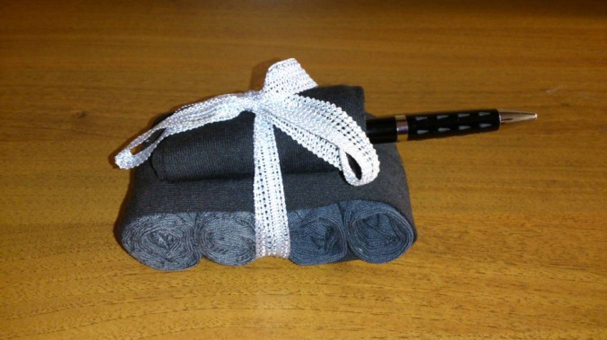 Делаем башню танка. Для этого раскладываем носок так же, как и предыдущие. Начинаем сворачивать с резинки, но не в трубочку, а загиб делать на ширину резинки. Переворачиваем башню так, чтобы не было видно конец носка.
