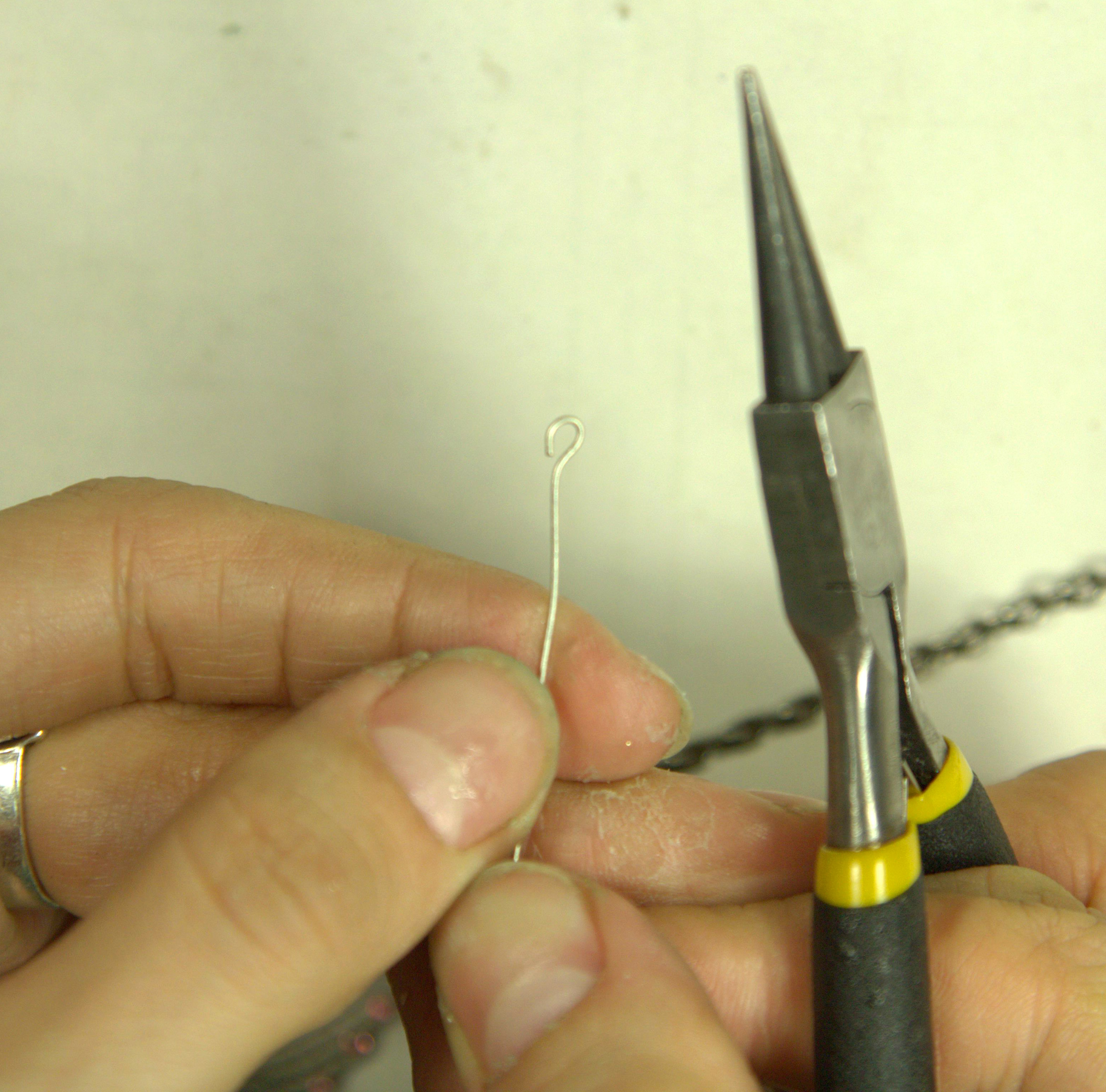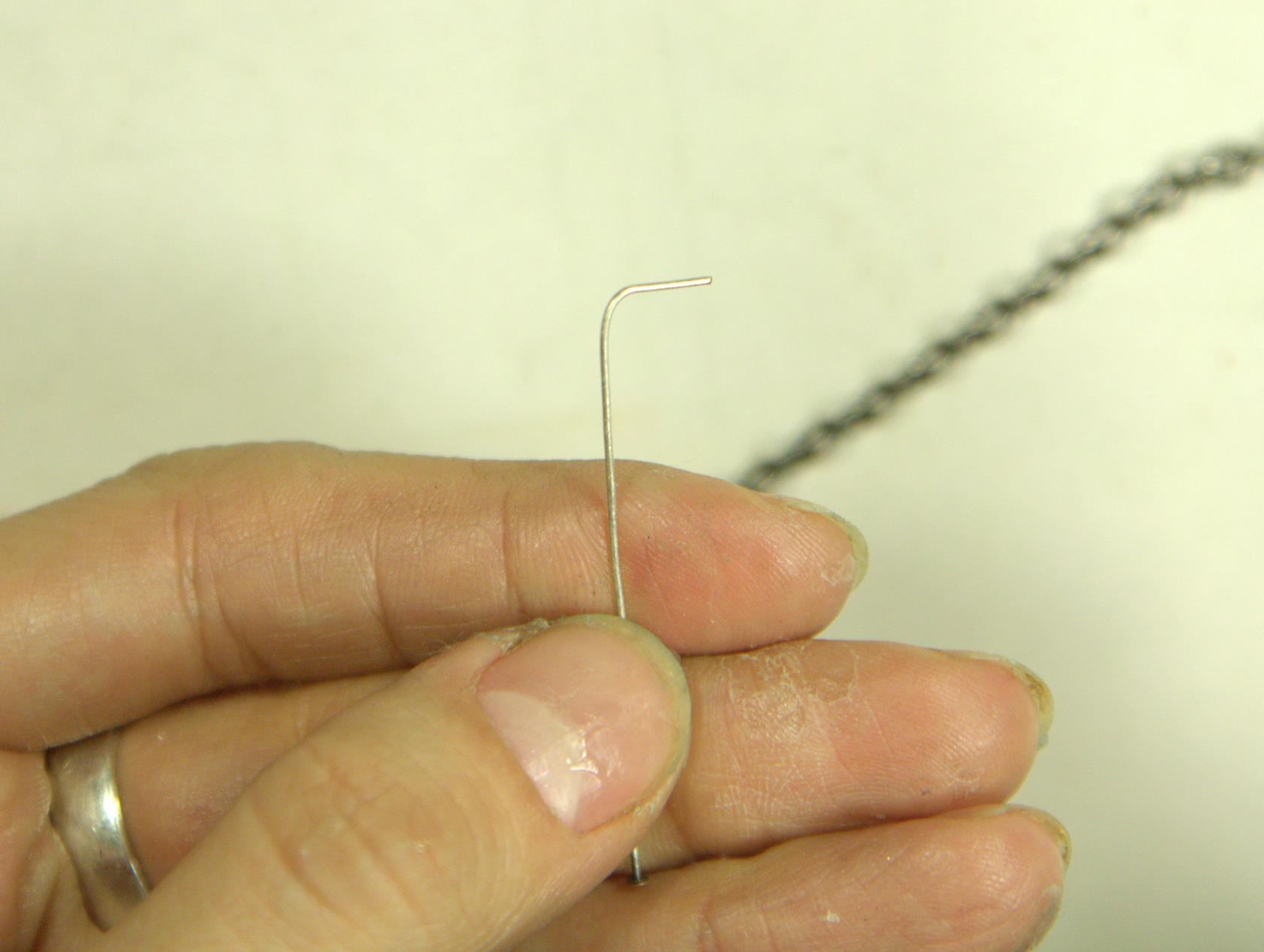 Далее подготовим декоративные элементы, которые будут украшать нашу цепочку. Для этого возьмём пин (вообще лучше брать штифт с петлёй, я использовала пин, т.к. у меня не было штифтов) и сделаем петельку на одном его конце. Для этого согнём кончик под углом 90 градусов так, чтобы он равнялся приблизительно 6-8 мм.