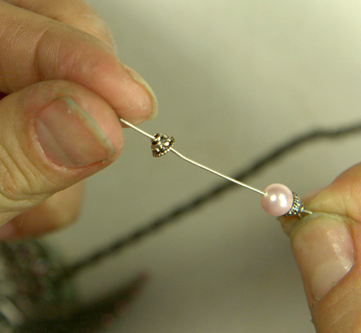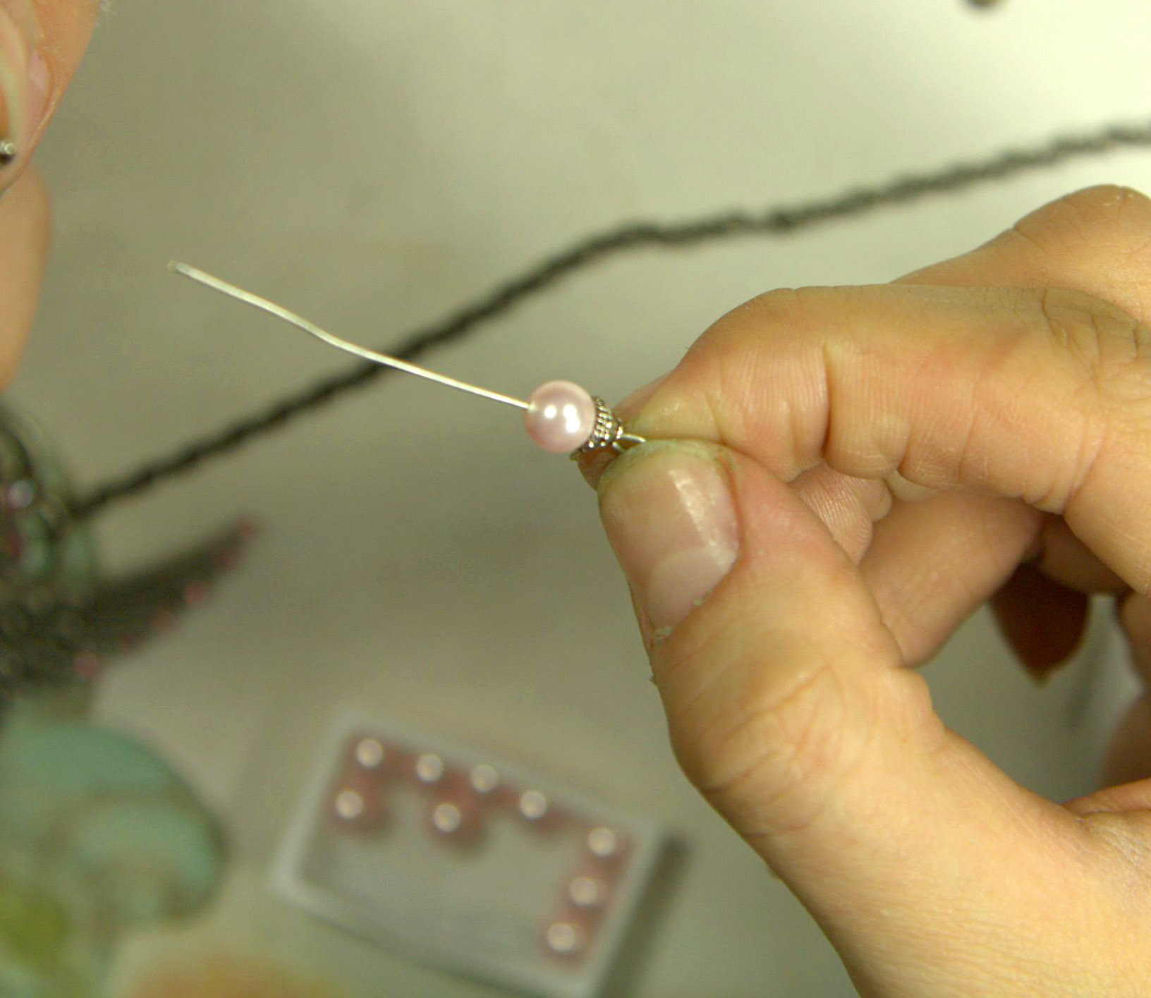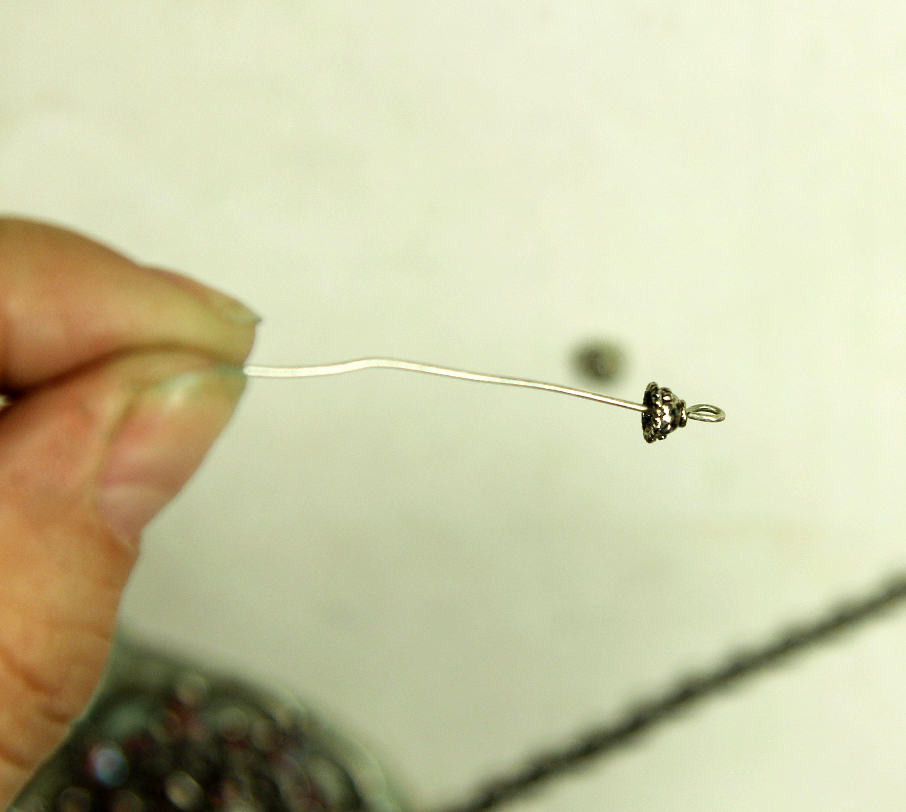 Отрезаем с другой стороны шляпку и продеваем бусинки в таком порядке: сначала шапочка для бусины, жемчужинка, 2-ая шапочка, затем бусина-цветочек Сваровски и повторяем жемчужинку вместе с шапочками.