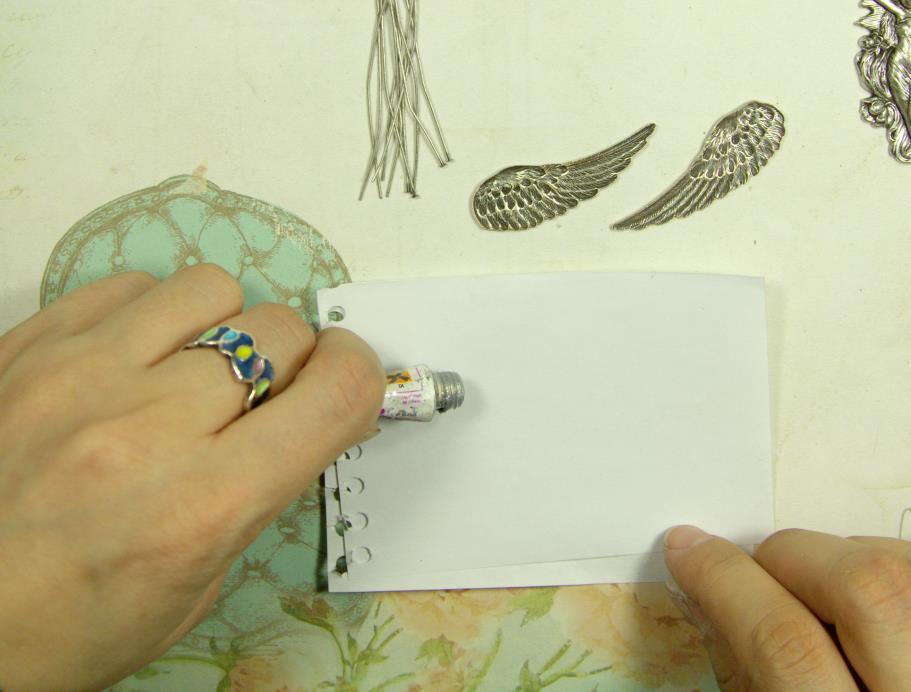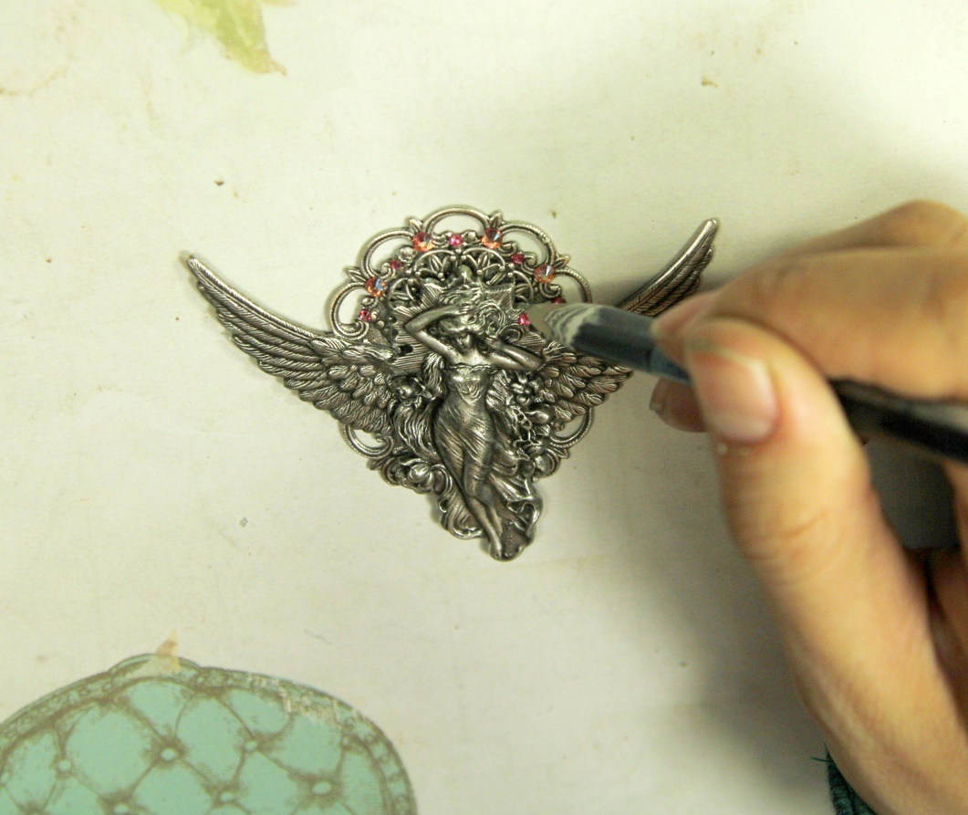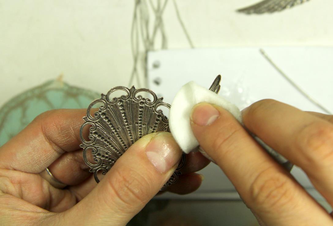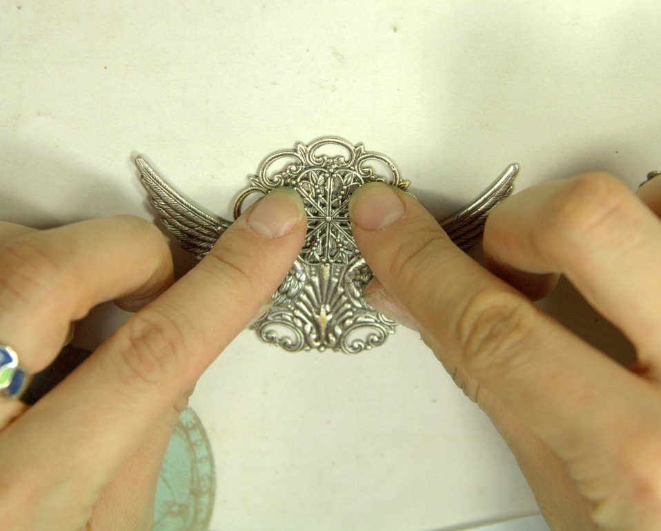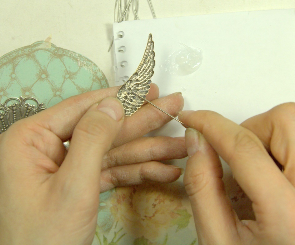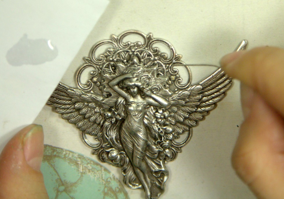 Теперь приклеиваем нашу винтажную филигрань к основе. Перед приклеиванием проделываем те же процедуры, что и с крыльями.