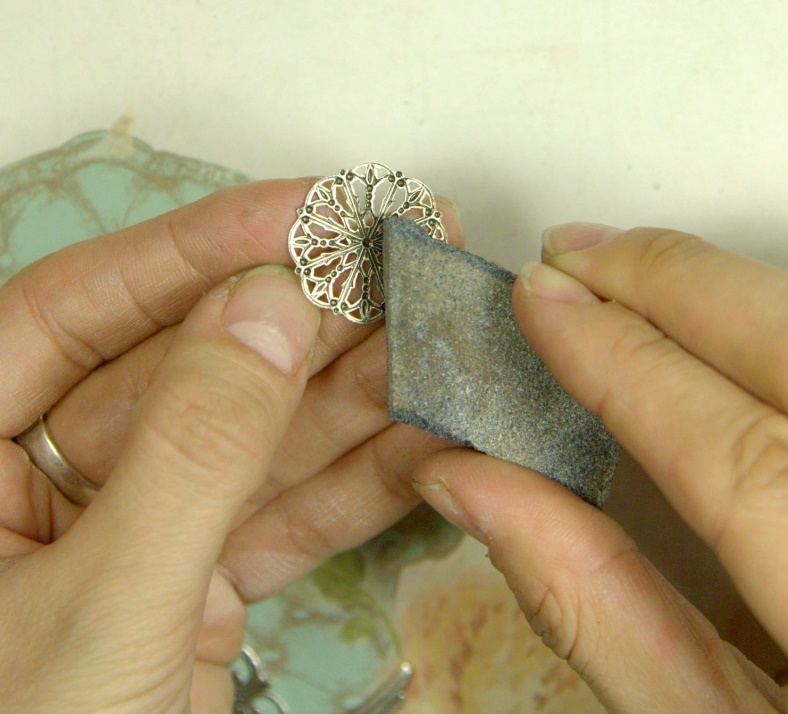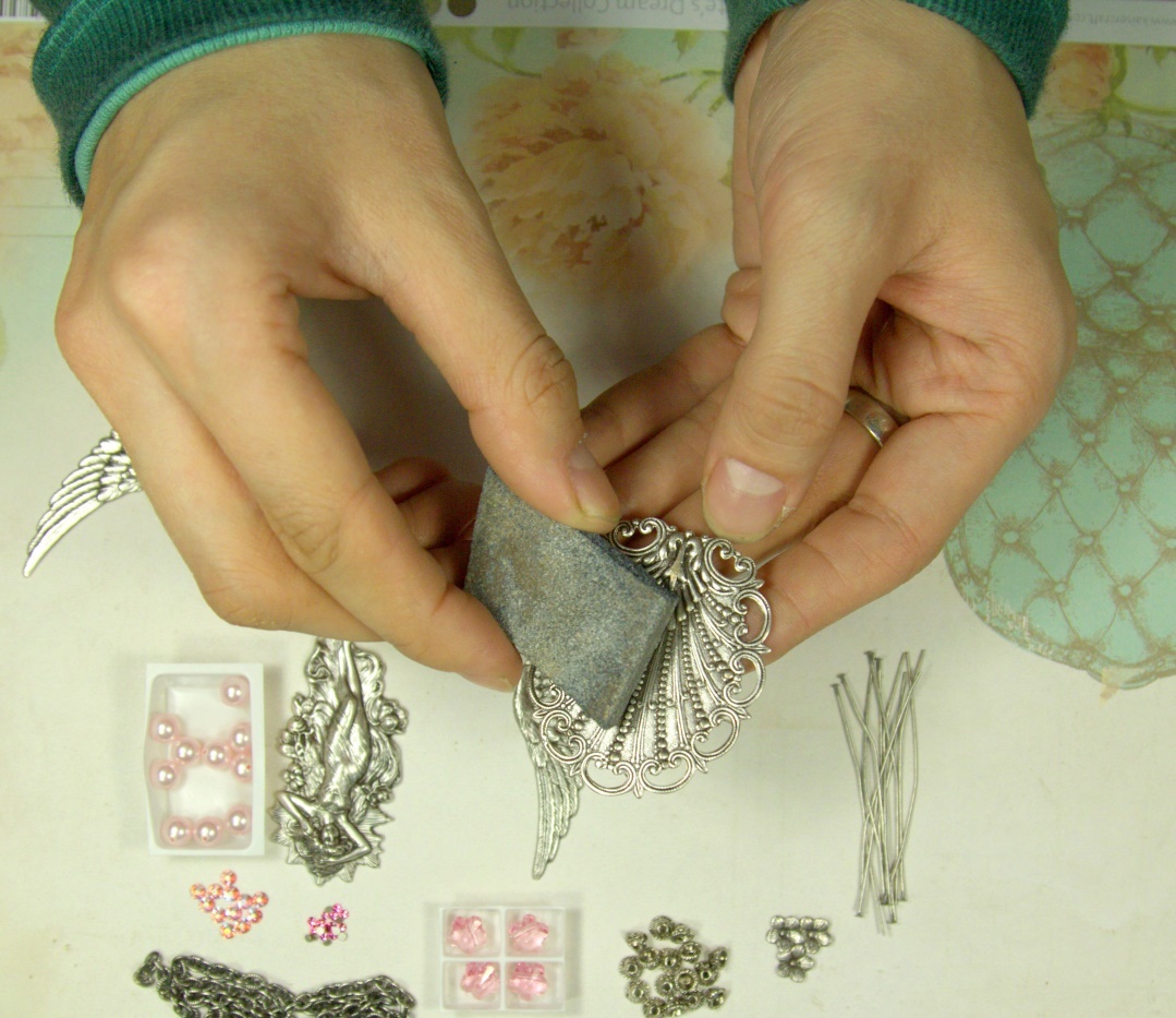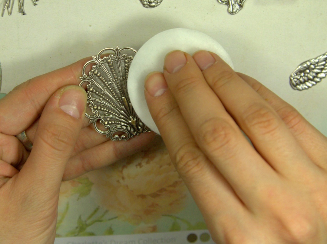 Сначала сделаем наш основной кулон со штампом “Богиня”. Возьмём нашу основу-штамп, на которую мы будем приклеивать другие элементы, и пошкурим её поверхность немного, а затем протрём с помощью ватного диска ацетоном (чтобы снять жирные пятна). Это делается для того, чтобы клей лучше схватился.