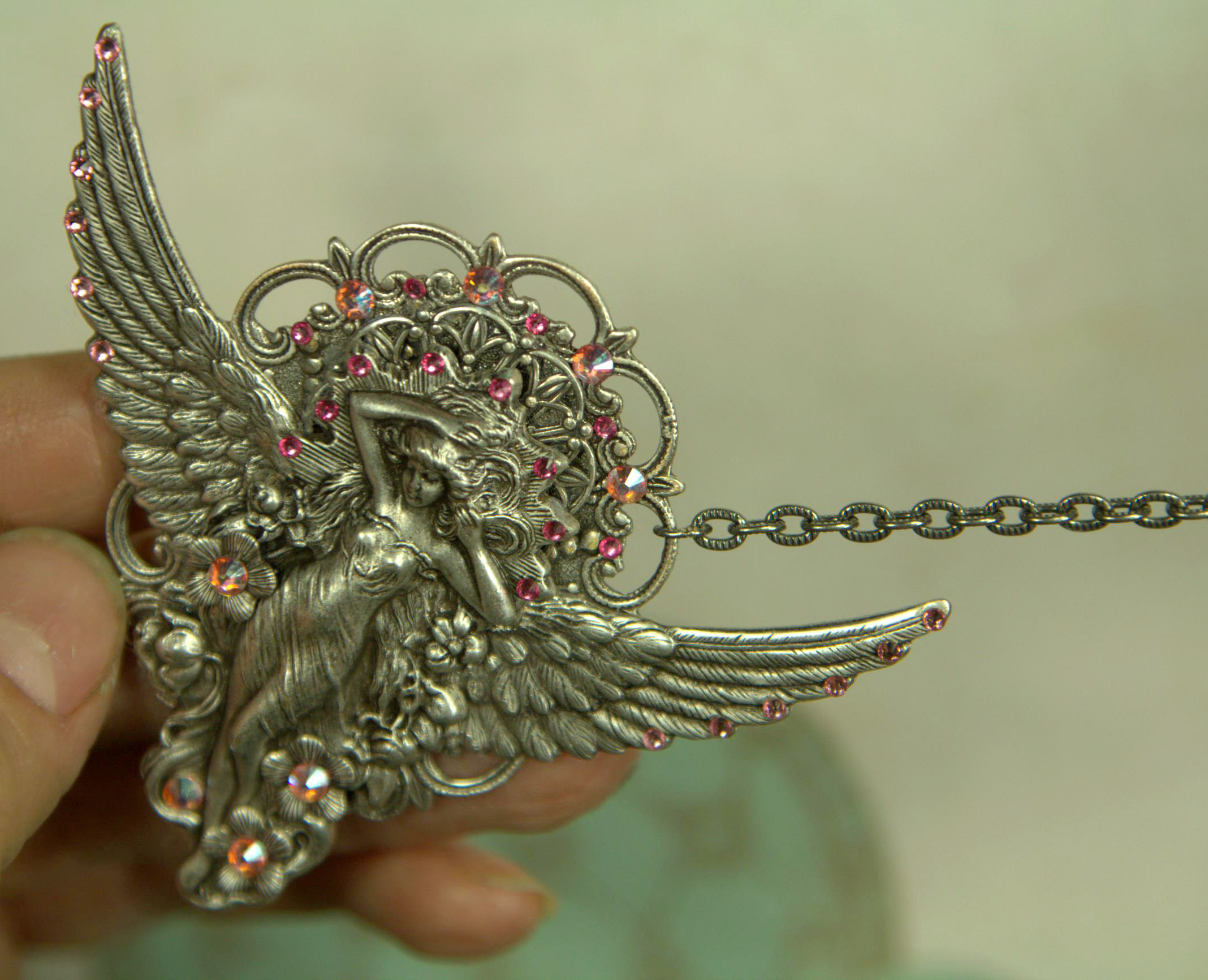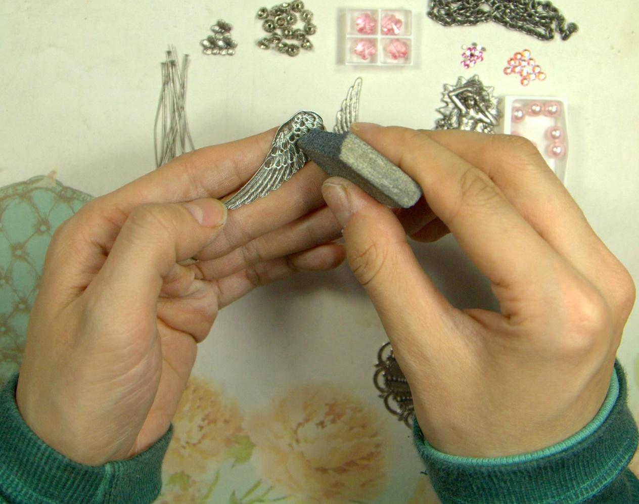 На цветочки приклеиваем стразики 3 мм, а также 1 страз внизу с левой стороны. В итоге у нас получилось 3 цветочка со стразами и 1 без цветочка.Также приклеиваем стразы маленькие к крыльям. Всё.))Наш кулон готов.