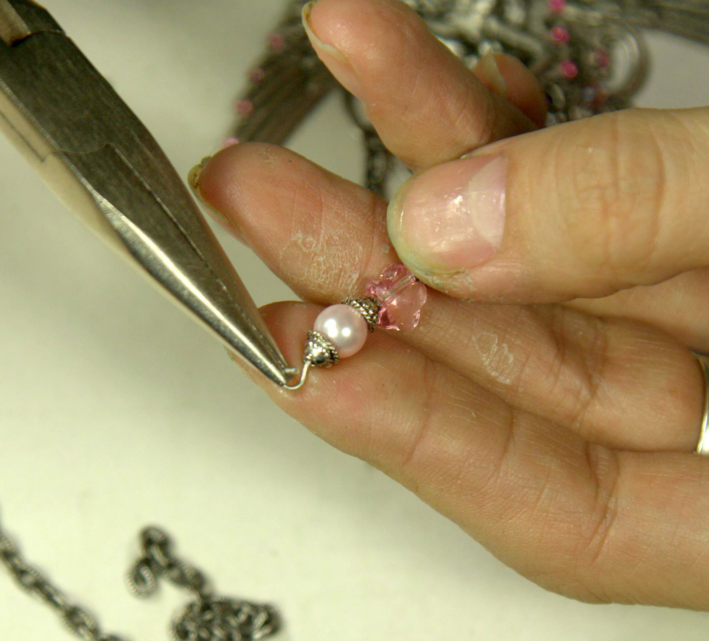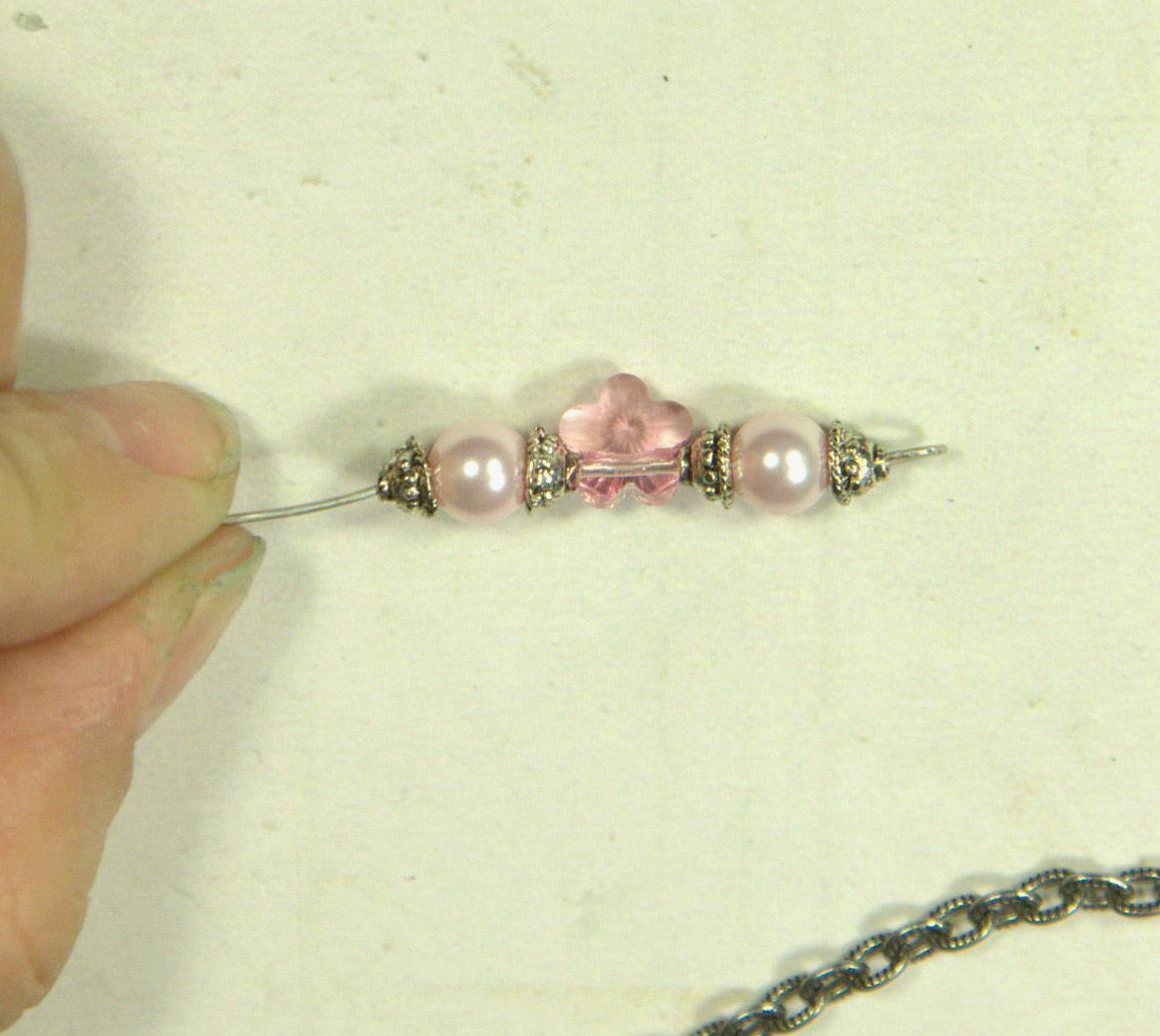 Через 4 звена также разъединяем цепочку и прицепляем штифт с 1 жемчужиной и шапочками, а ещё через 4 снова такую же декоративную конструкцию. В результате получается такая вот цепочка.
