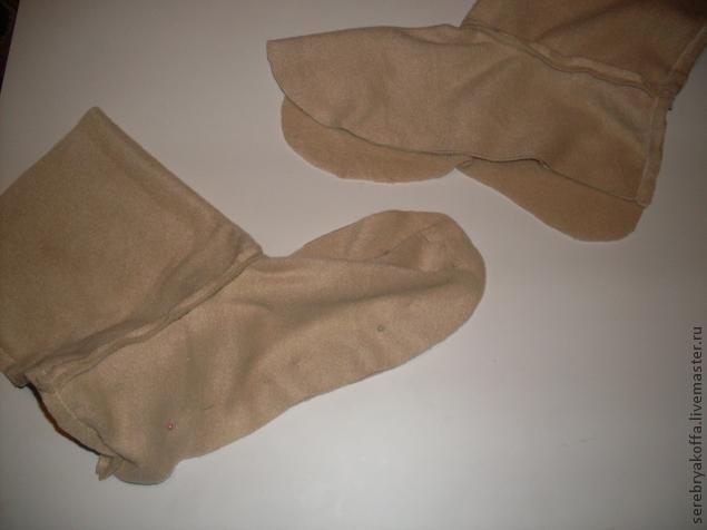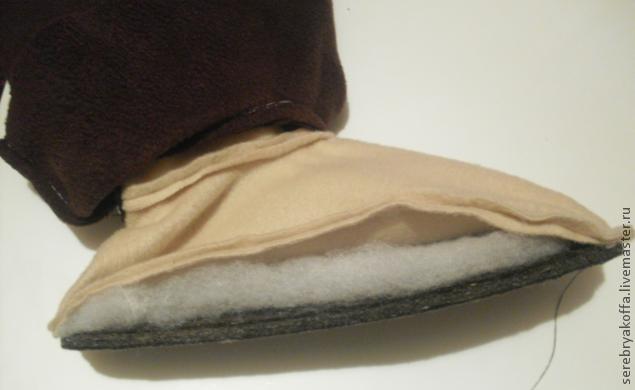 Через отверстие выверните нижнюю часть подкладки сапожка и пришейте к ней деталь подошвы из материала подкладки. Повторите для второго сапожка.