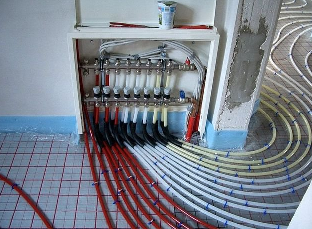 После прокладки труб нужно проверить их прочность и герметичность всех стыков. Для этого внутрь системы подается вода под определенным давлением. Если тестирование проходит без проблем, то можно приступить к заливке. Покрытие должно быть ровным, а сверху по нему прокладывается линолеум.