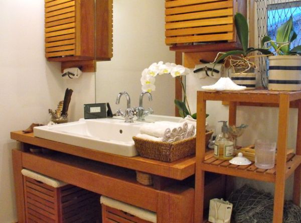 Поддержать деревянную фактуру могут шкафчики из древесины, отделка зеркал, окон, двери. Дерево отлично сочетается с белой керамикой и зеленью живых растений, и этот микс идеален для стиля эко.