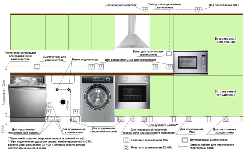 Очень важной является схема электропроводки, которую следует тщательно продумать. Помимо полного освещения, необходимо позаботиться о наличии нужного количества розеток. Для этого рекомендуется продумать, сколько бытовой техники планируется на кухне, и где она будет стоять.