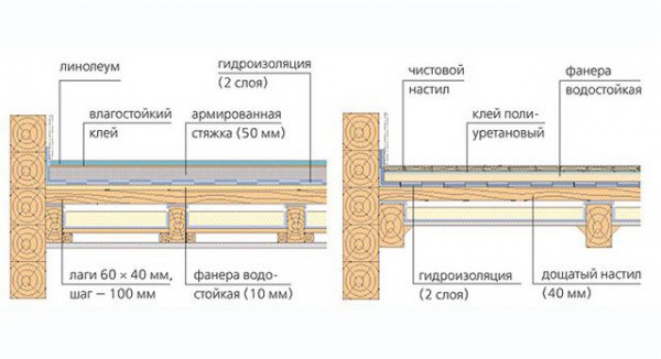 Внимание! На лаги кладут влагоустойчивую фанеру толщиной в 12 мм, которая обеспечит надежную и прочную основу.