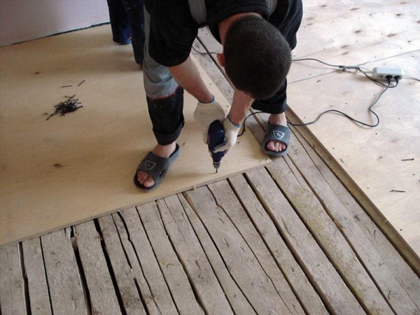 Старый дощатый пол покрыть листами влагоустойчивой фанеры