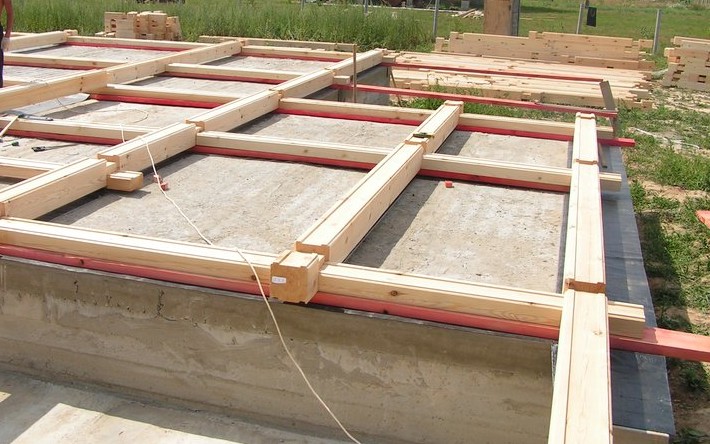 - Пол – При кладке окладного венца кладут и черновой пол, как опора служит черепной брус размерами 50х50 мм, сверху на него укладываются доски чернового пола 20 мм, между брусьями кладутся лаги для будущего чистового пола. Соединение с внешним венцом происходит с помощью «ласточкиного хвоста».