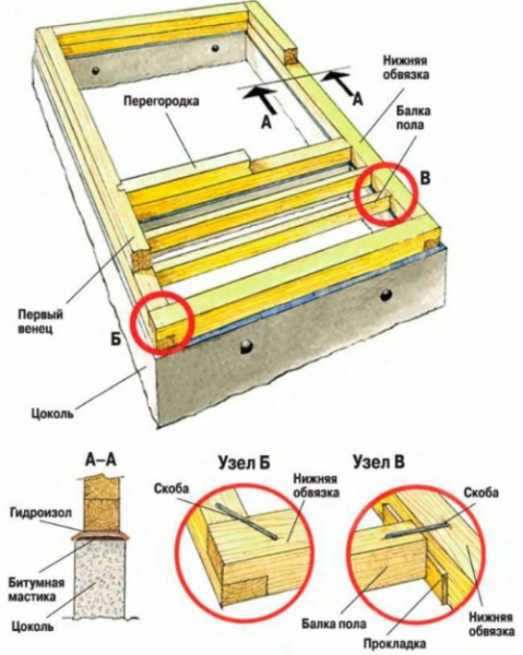 Схема крепления нижней обвязки и гидроизоляции под первый венец.