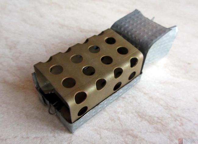 При надобности торцы зашивают сеткой с ячейкой меньшего размера или цельным жестяным листом. По краям сетки стачивают заусенцы, предотвращая всевозможные спутывания изделия со шнуром, исключая при этом его подрезы и деформации. Обработанная напильником конструкция готова к применениям на сильных течениях.