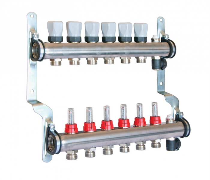 - При выборе любой схемы присоединения теплого водяного пола к централизованной системе отопления используется крепление к боковому входу коллектора с применением фитингов.
