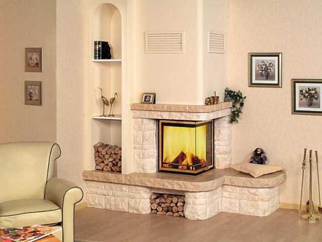 Если площадь комнаты у вас 20 м либо чуть больше и вы хотите установить настоящий камин на дровах с живым пламенем, то отдайте предпочтение угловому.