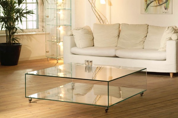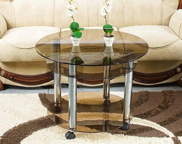 Стеклянный столик, отличающийся изяществом и легкостью, идеально сочетает как классику, так и современный дизайн. Прозрачность материала визуально расширяет окружающее пространство. Стеклянный может быть весь стол или одна столешница. Если это маленькая деталь, то удобно наличие колесиков, которые не выдержат большую нагрузку от стекла. В отличие от дерева, материал менее прочный.