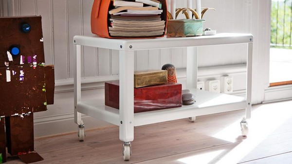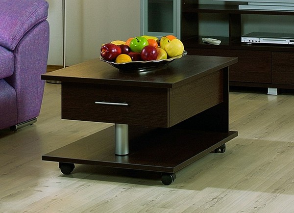 Наибольшей практичностью отличается журнальный столик на колесах, который свободно перемещается не только в пределах одного помещения, но и по всей квартире. Такой столик на колесах можно использовать и в качестве сервировочного стола, и как подставку под ноутбук, и просто как оригинальный предмет интерьера.