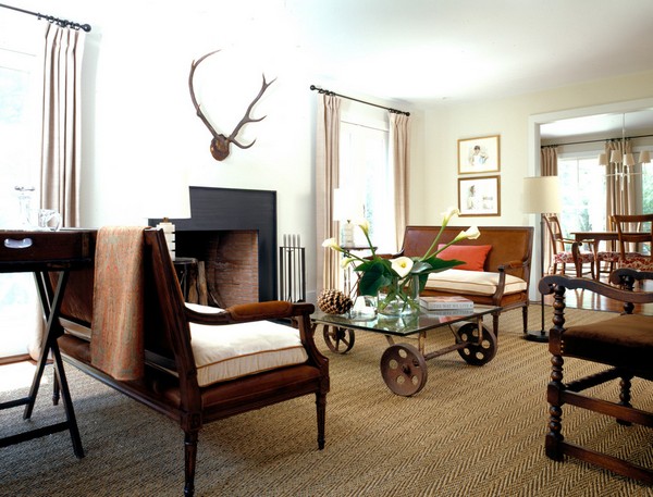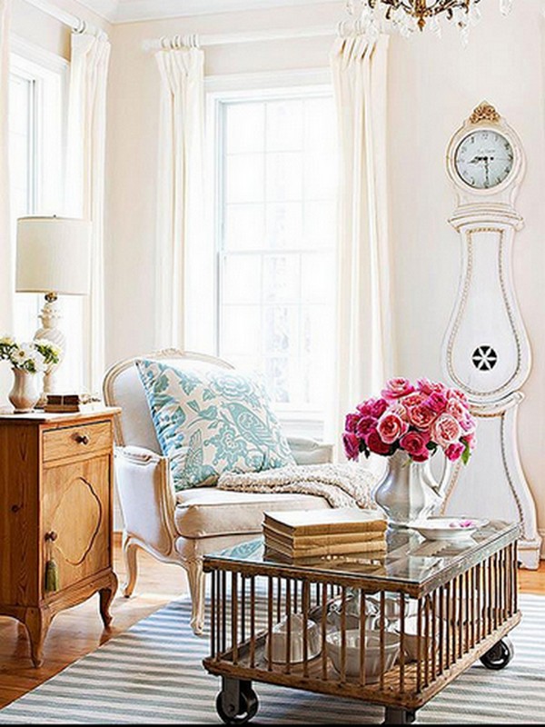 Помещения в стиле кантри отличаются простотой, естественностью и близостью к природе. Нехитрая меблировка, а также плетеные и деревянные элементы без тщательной отделки впишутся в такой дизайн как нельзя кстати. Столик в данном стиле может быть представлен необработанным деревянным массивом, который станет отличной частью интерьера. Декор может быть выбран на ваше усмотрение, но надо помнить про природную тематику.