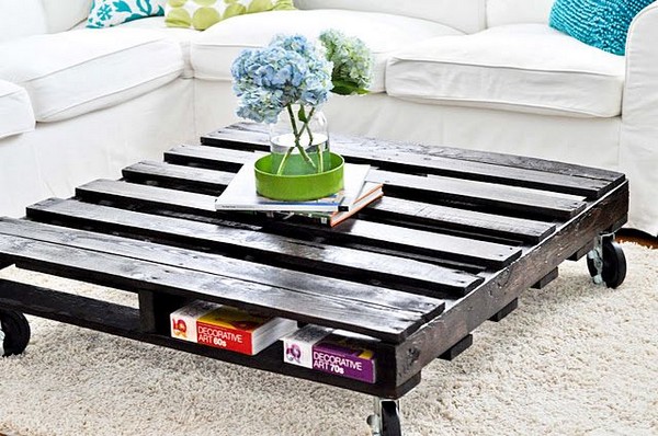 Строительные поддоны являются отличным материалам для созданиянеобычных журнальных столиков. Можно использовать один поддон либо же сложить несколько изделий таким образом, чтобы они представляли единый элемент. Поскольку такой столик не предусматривает наличие ножек, колеса монтируются к основанию нижнего поддона. В дополнение столик из поддонов можно покрыть лаком или краской.