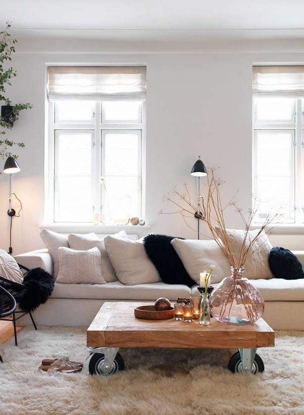 «Сырые» деревянные доски — хороший материал для столика, декорирующего гостиную в скандинавском стиле