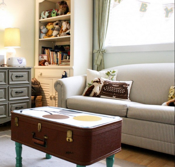 Если добавить ножки старинному чемодану из хорошей кожи, то его можно превратить в отличный журнальный столик в стиле ретро.
