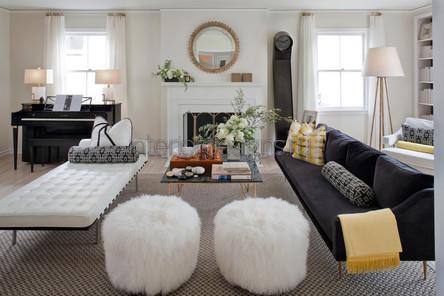 Что касается цвета обивки, то здесь можно пойти двумя путями: выбрать изделие в тон основной мебельной группе/антуражу или же прибегнуть к приему контраста для создания акцента. Первый шаблон рекомендуется использовать при меблировке спален и гостиных. Если полностью монохромный вариант кажется вам скучным, используйте прием комбинирования. Например, подберите пуфики в интерьер в одном цвете со шторами, диванными подушками, изголовьем кровати или другими аксессуарами.
