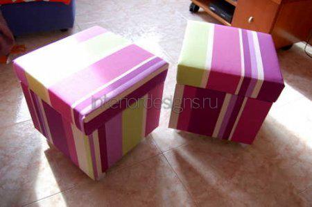 – пуфик-коробка. Это самый распространенный вид мягких сидений, представляющий собой каркас в форме параллелепипеда и откидной верх, под которым прячется система хранения;