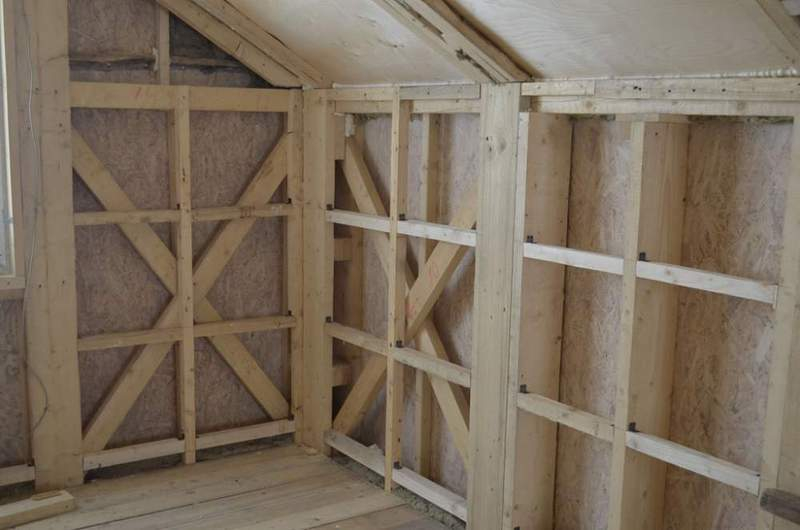 - Возведение каркаса рекомендуется осуществлять из древесины хвойных пород. Касательно влажности, то уровень не должен превышать 15%. А иначе при высыхании каркаса саморезы попросту выпадут из древесины.