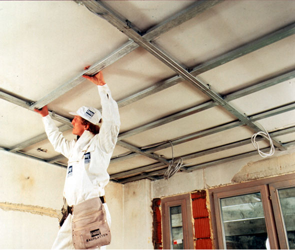 В отличие от стен, установка обрешетки для гипсокартона на потолочное перекрытие имеет свою специфику и нюансы. В основе каркаса применяются два вида профиля: UD и CD. Если требуется произвести потолок фигурной формы или многоуровневый, то в каркасе используют такие профили, как CW и UW. Их толщина может варьироваться от 50 мм до 100 мм.