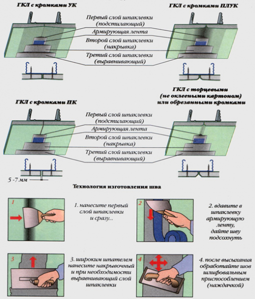 Приготовленный раствор шпаклевки наносится поперек швов и тщательно втирается в глубь стыков, на всю толщину ГКЛ. На нанесенную смесь укладывается «серпянка» и втирающим движением шпателя заделывается в швы. После установки сетки широким шпателем выравниваем неровности и удаляем излишки раствора со стыков. Далее швы сушатся и шлифуются.