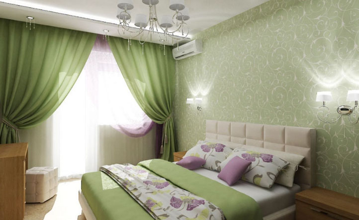 Сейчас в продаже много тканей с интересным рисунком и орнаментом, вышивкой и элегантными вставками из другого текстиля. Выбирая зелёные занавески в комнату, где отдыхают и спят, учитывают эти особенности помещений. Здесь не нужна яркость, поэтому дизайнеры советуют использовать нежные оттенки зелёного: