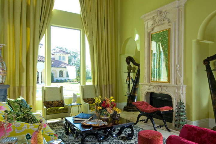 В помещение с меблировкой яркой расцветки желательно подобрать шторы светлых тонов или повесить двухцветные занавески (зелёно-персиковые, изумрудно-жёлтые, оливково-бежевые).