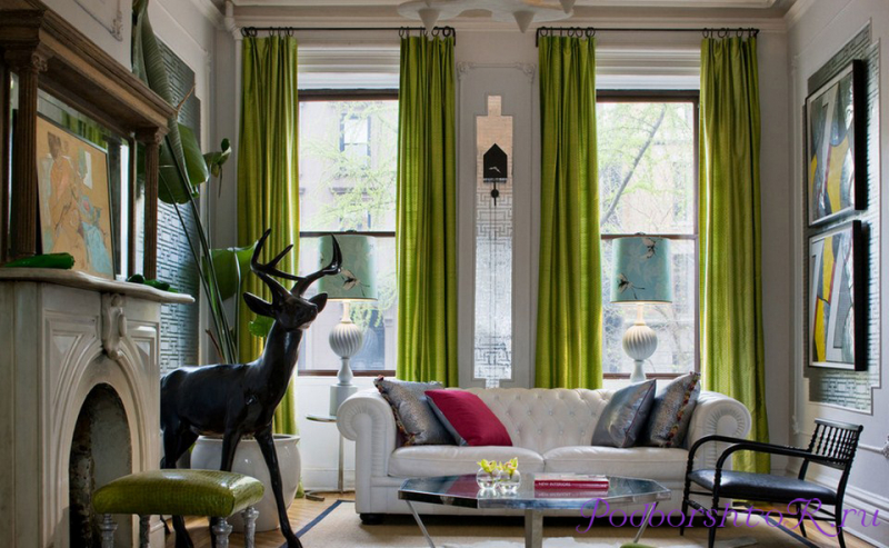 Зелёные шторы в гостиной лучше не использовать, поскольку интерьер с ними будет казаться чересчур вялым и умиротворённым.