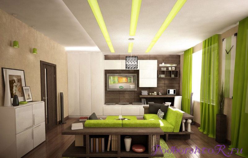 Гостиная – место приёма гостей и семейного отдыха. Здесь должно быть уютно и комфортно каждому человеку. Этому могут способствовать зелёные шторы, подобранные в тон обоев и обивки мягкой мебели.