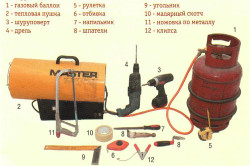 - Воздухонагреватель (только для ПВХ-потолка) – специалисты, занимающиеся установкой потолка, привозят тепловую пушку и газовый баллон для ее работы. При самостоятельной установке потолка можно использовать комнатный обогреватель для нагрева помещения и горячий фен для разглаживания складок на полотне.
