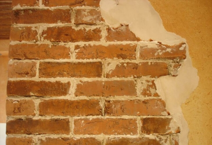 Старую оштукатуренную поверхность нужно очистить до кирпича. Прежде всего, испытывают такой многолетний слой на крепость. В случае, если он разламывается и отлетает без каких-либо особых напряжений, процесс удаления не будет трудным. Если он напротив прочный и без изъянов, тогда допускается его вообще не удалять. При присутствии самых различных, в том числе и скрытых и малозаметных дефектов, щелей и пустот всю застаревшую штукатурку следует очистить целиком. Для того чтобы точно узнать крепость штукатурного покрова — нужно стукнуть по поверхности стены молотком.