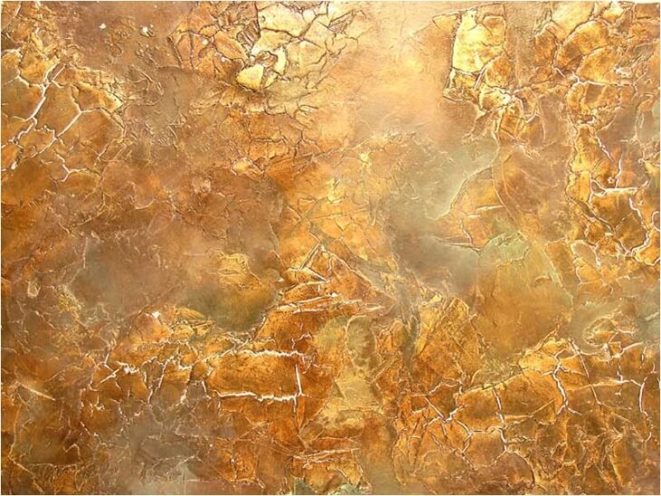 В смесь добавляется известь и мраморная крошка. Каждый слой наносится резиновым инструментом на толщину 5-6 мм и требует тщательного высыхания. В раствор допустимо вносить различные колеры, что позволяет имитировать драгоценные металлы, глянец или матовый оттенок.