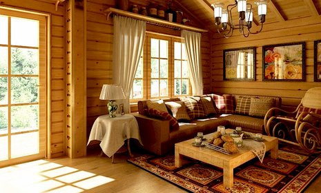 - Используется много натурального дерева. Оно служит не только материалом для отделки поверхностей, но и сырьем для мебели. Использовать лучше всего сорта древесины, распространенной в России (сосна, дуб, ясен, кедр, береза).