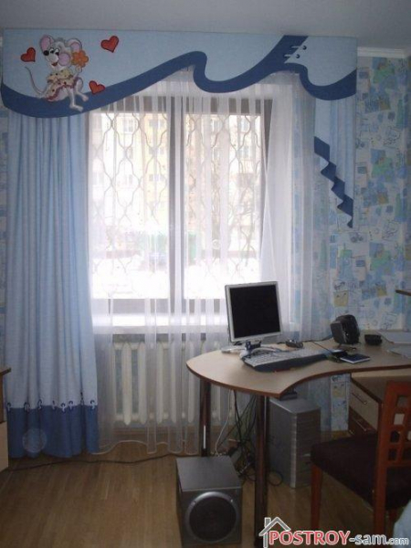 Одним из популярных вариантов штор для комнаты мальчика является жесткий ламбрекен, закрывающий карниз. На нем может располагаться аппликация на определенную тему, интересную мальчику. Такие шторы стоять дорого и сложны в уходе, но смотрятся очень оригинально. Если родители решили сделать шторы с ламбрекеном, то тюль и портьеры должны быть спокойных неярких тонов, чтобы все внимание акцентировалось на декоративных деталях ламбрекена.
