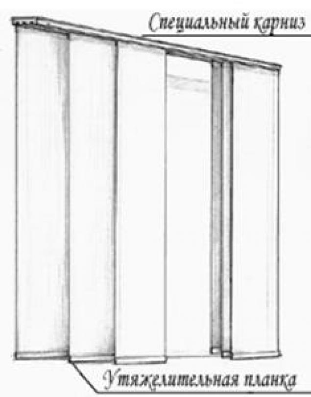 Еще один вариант оформления проема – японские панельные шторы. Использовать их рекомендуется только в том случае, если проем широкий, в противном случае они будут плохо смотреться. Их можно использовать как в качестве самостоятельного оформления, так и как маскирующий вариант дверного полотна.
