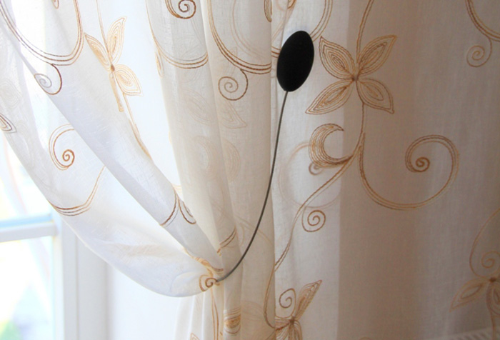 Для округлых карнизов в последнее время на шторах предусматриваются петли, выполненные из той же ткани, что и шторы. В таком случае они выкраиваются из срезанных кусков материи по 10-15 см в ширину (для двойного складывания) и 15-20 см в длину (в зависимости от высоты прикрепления карниза над оконным проемом). Прикрепляются тканевые петли внутрь обтачки либо оформляются отдельным швом, выполненным художественным способом.