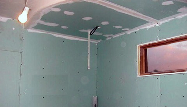 - Делается обшивка каркаса листами гипсокартона устойчивого к влаге. Для крепежа Листы гипсокартона применяют саморезы. При установке листы должны вплотную примыкать друг к другу, а после нужно закрыть все соединения армирующей лентой и отделать влагоотталкивающей шпатлевкой . По такой же технологии отделываются все углы. Применение герметика сделает надёжную защиту от большой влажности комнаты где стоит ванна. Чтоб закрепить систему, применяют 2 слоя листов, плюс к этому еще один слой гипса фиксируется на обыкновенный клей. Если в потолок устанавливается освещение, необходимо применять только особые водостойкие источники света, какие используют в помещениях с большим уровнем влаги.