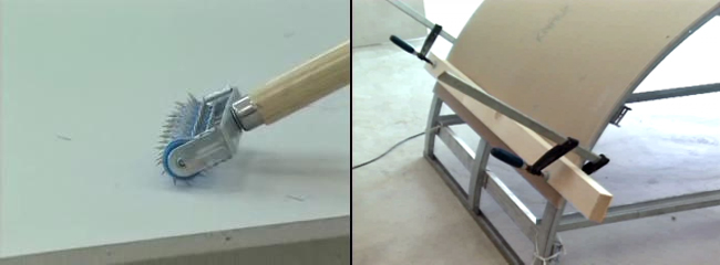 - Лист гипса нужно хорошо смочить, дать нужную форму и оставить на определённое время просохнуть. Для смачивания листа лучше применять валик с металлическими иглами, тогда влажность быстро попадёт вовнутрь.