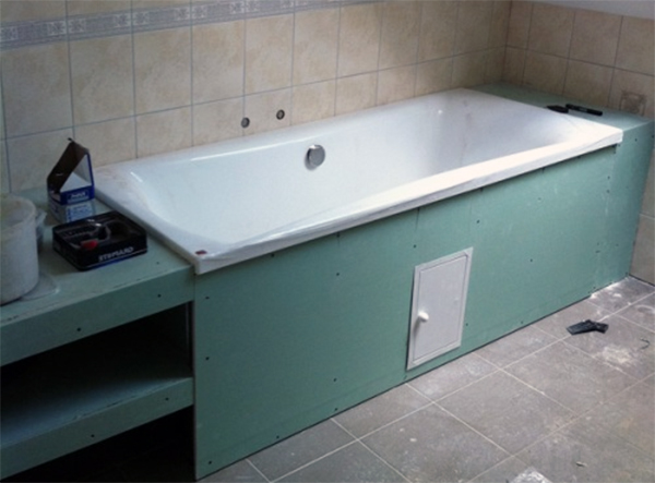 КГЛ можно применять для обшивки каркаса для экрана ванной. Дальше, его можно обклеить плиткой из кафеля, чтобы сделать комфорт в помещении. Но необходимо пытаться, чтоб вода не попадала за ванну, ведь по прошествии какого то времени неизменная влажность приведёт к деформированию листов гипсокартона устойчивого к влаге. И поэтому лучше всего сразу рассчитать надёжную изоляцию от влаги.