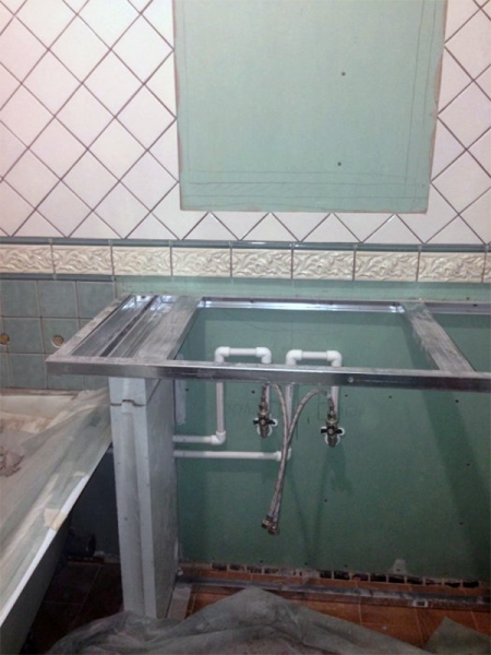 - ГКЛВ нельзя клеить в ванной. Их монтируют на металлический каркас. Каркасную основу делают с поперечными горизонтальными профилями. Это идет как усиление основы, способной выдержать вес плитки и клей.