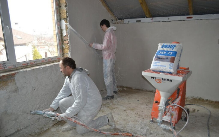 Крупные объекты (производственные цеха, складские помещения, торговые залы) рационально штукатурить с использованием специального оборудования. Ручной труд мастера применяют на объектах небольшого метража – жилые дома, квартиры, офисные помещения. Использование в работе штукатурного оборудования требует участия в процессе как минимум трех мастеров – засыпка смеси, подача раствора, разравнивание правилом.