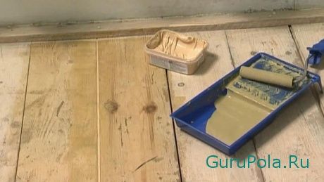 Доски очищаются от старой краски, жирных пятен, мусора и пыли, плинтусы снимают и укладывают вместо них тонкие дощечки, чтобы в зазоры не попадал раствор. Щели между полом и дощечками, а также мелкие трещины и выемки зашпаклевывают, всю поверхность грунтуют.