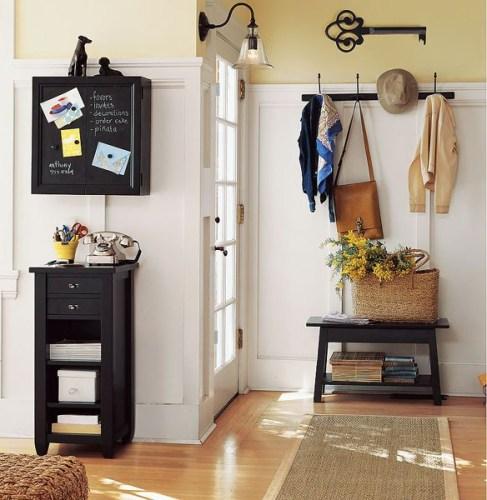 Если места для шкафа-купе нет, можно обойтись простой вешалкой или рядом крючков на стене. При этом на них должна быть только та одежда, которая носится именно сейчас. Для обуви можно приобрести слим-обувницу или простую подставку. Преимуществом первой является то, что ее можно использовать, как скамейку, на которую можно присесть, чтобы обуться. Остальные предметы мебели или декора могут находиться в прихожей только тогда, когда это позволяет ее площадь.