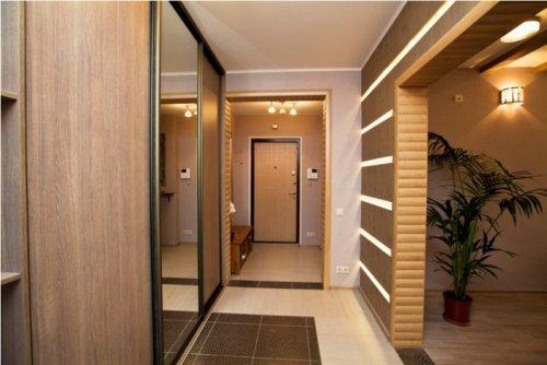 Самый радикальный способ расширения прихожей – реконструкция всей квартиры и объединение отдельных помещений. Если в квартире нет несущих стен, можно всю ее превратить в одну студию, разделенную с помощью отделки, освещения и мебели на отдельные функциональные зоны. В этом случае прихожая просто «сольется» с общей площадью, а выделить ее можно будет фактурой или цветом отделки стен и пола. Из мебели прекрасно подойдет встроенный шкаф-купе с зеркальными дверцами.