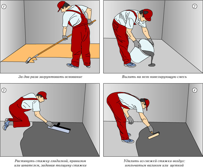 Жидкая смесь наливается на подготовленный участок равномерно и непрерывно, сделать это нужно не более чем за 1 час во избежание затвердевания раствора. Потом с поверхности удаляются воздушные пузырьки с помощью игольчатого валика. После этого переходят к аналогичной работе на следующем участке.